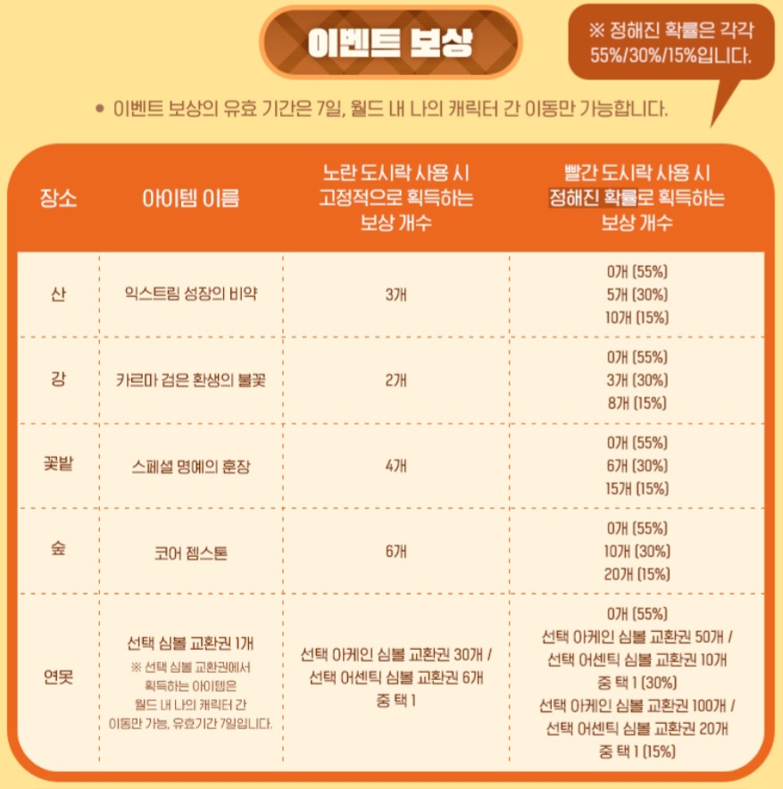 5종류의 보상 중 원하는 보상을 총 3종류 얻을 수 있으며, 각각의 보상의 갯수는 고정갯수를 얻을 수 있는 노랑보따리와 랜덤한 갯수를 얻을 수 있는 빨강보따리 중에서 선택하실 수 있습니다.