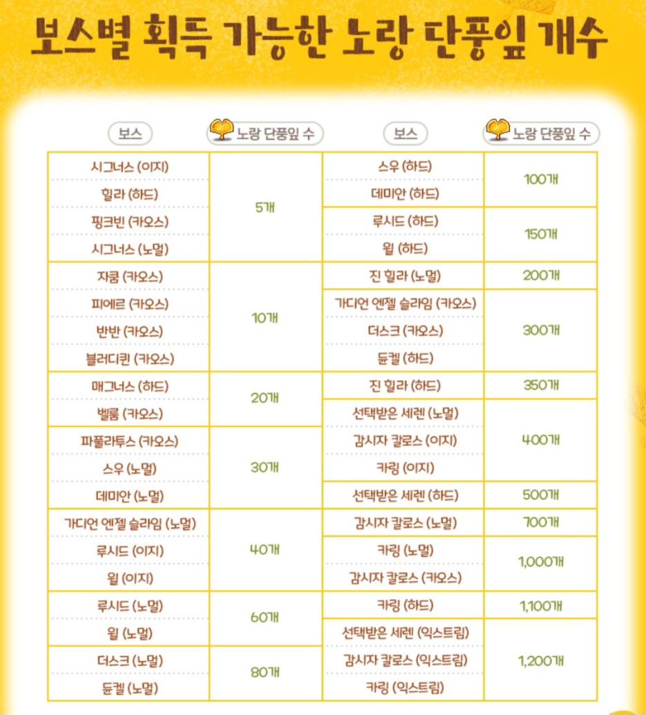 보스별 획득가능한 노랑 단풍잎 개수예요.