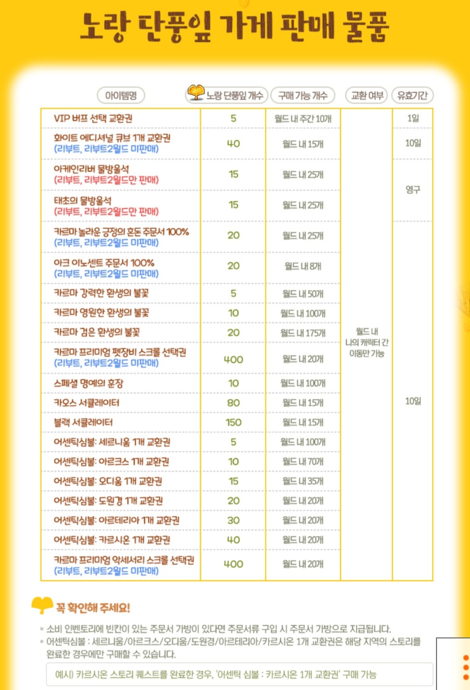 주간보스를 잡아 노랑 단풍잎 재화를 모아서 이용가능한 주간보스 코인샵 이벤트입니다.