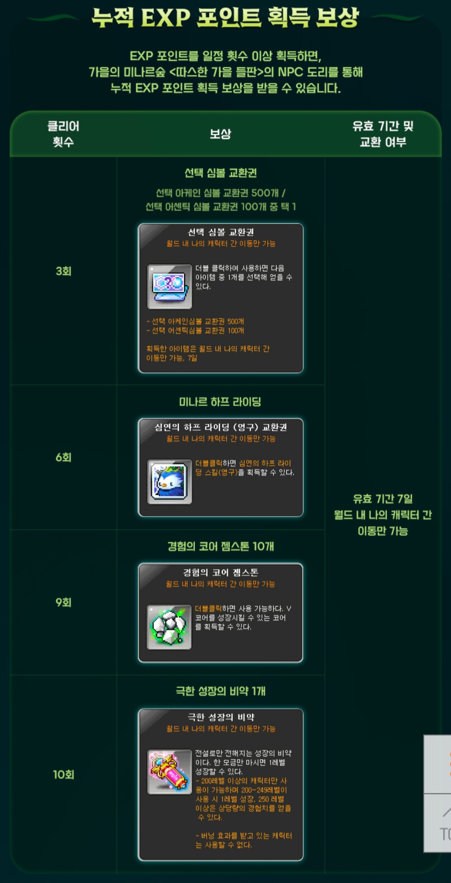 월드 당 일주일에 한번, 1개 캐릭터로 1회 경험치 보상을 얻을 수 있는 펀치킹 이벤트입니다.
